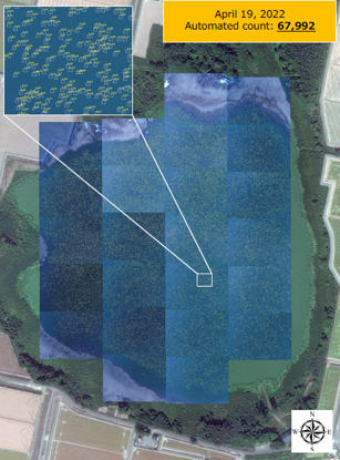 しかしながら、通常、大規模な水鳥の群れをカウントするためには経験豊富な人材が必要となります。 そこで、UAV(ドローン)写真測量が従来の鳥類カウント手法に代わり、人材不足などの課題をクリアにする可能性が高いと考え、 当センターではUAVとディープラーニング(機械学習)を組み合わせることでマガンの数を正確にカウントできるシステムを研究、構築しました。
